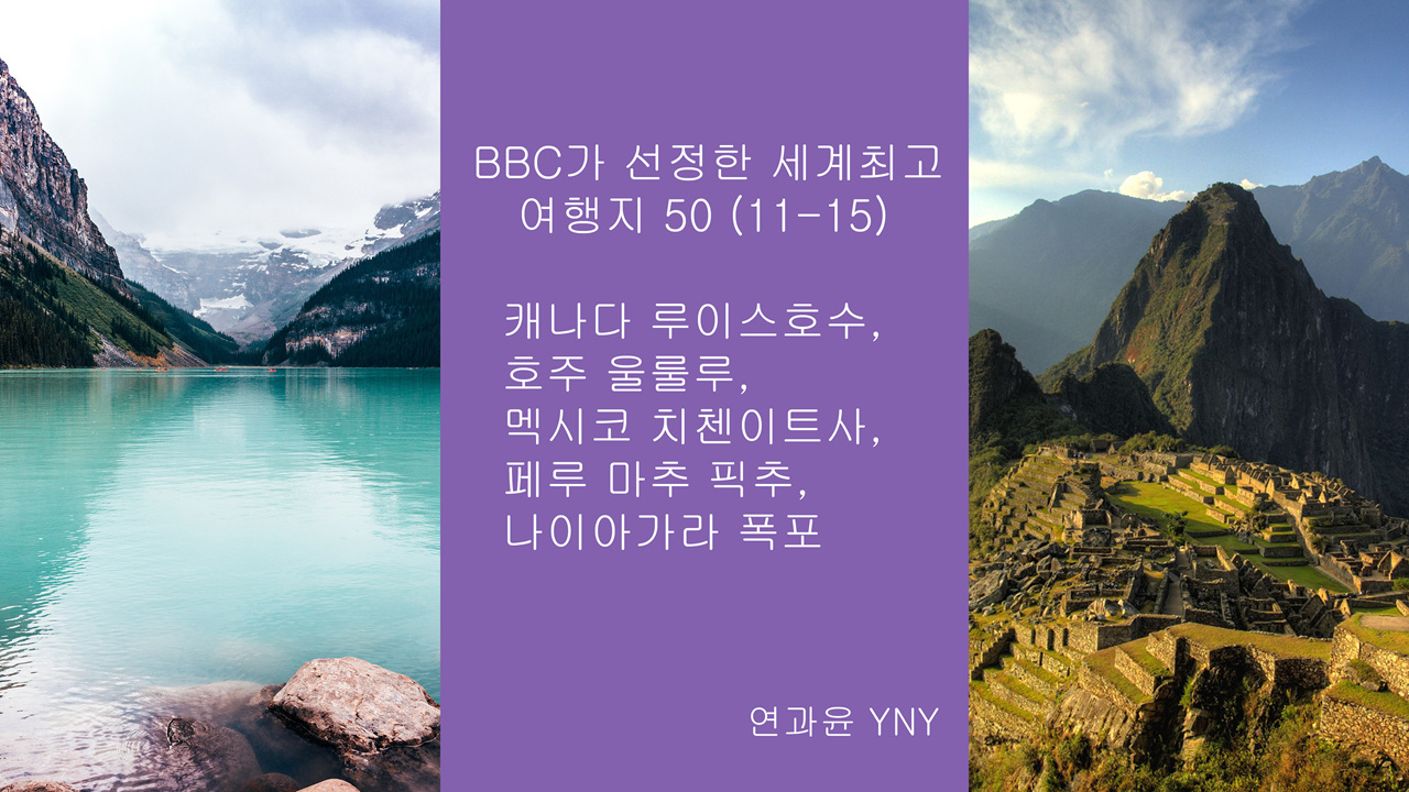 BBC가 선정한 세계최고 여행지 50 (11-15) BBC가 선정한 세계최고 여행지 50 (11-15) (7) BBC가 선정한 세계최고 여행지 50 (11-15)-캐나다 루이스호수, 호주 울룰루, 멕시코 치첸이트사, 페루 마추 픽추, 나이아가라 폭포 - YouTube 여행, 동물, 기타/여행과 풍경 (해외) 2022.09.21