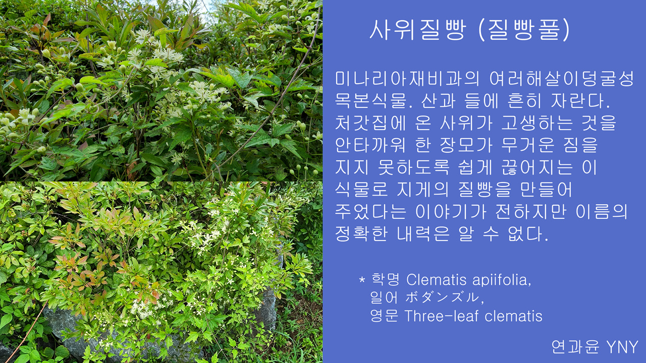 사위질빵 사위질빵 미나리아재비과의 덩굴식물. 산과 들에서 흔히 자란다. 길이 약 3m이다. 꽃은 7∼8월에 흰색으로 피고 지름 13∼25mm로서 잎겨드랑이에 취산상 원추꽃차례로 달린다. 열매는 수과(瘦果)로서 5∼10개씩 모여 달리고, 9∼10월에 익으며 흰색 또는 연한 갈색 털이 난 긴 암술대가 있다. .. J의 풀꽃과 나무 이야기/풀꽃 (야생화) 2018.09.29