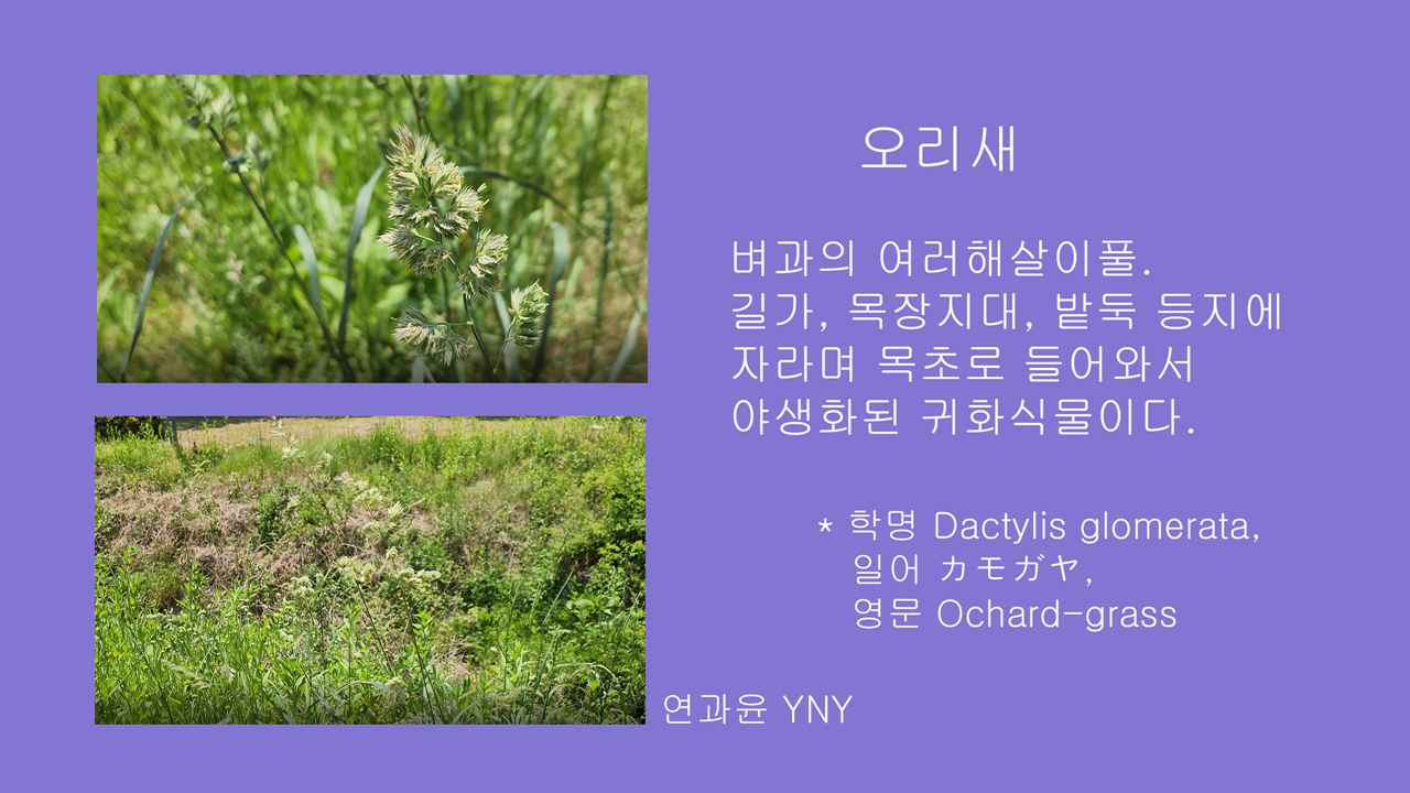 오리새 오리새 벼과의여러해살이풀. 서아시아, 유럽 원산으로 길가, 목장지대, 밭둑 등지에 자라며 목초로 들어와서 야생화된 귀화식물이다. 높이 약 1m 정도이다. 엽신은 길이 10~45cm, 엽초는 등 쪽이 접혀서 용골을 만든다. 화서는 원추화서를 이루며 길이 2~30cm, 소수들이 다발로 모여난다. 학명.. J의 풀꽃과 나무 이야기/벼과,사초과,골풀과 2018.07.19